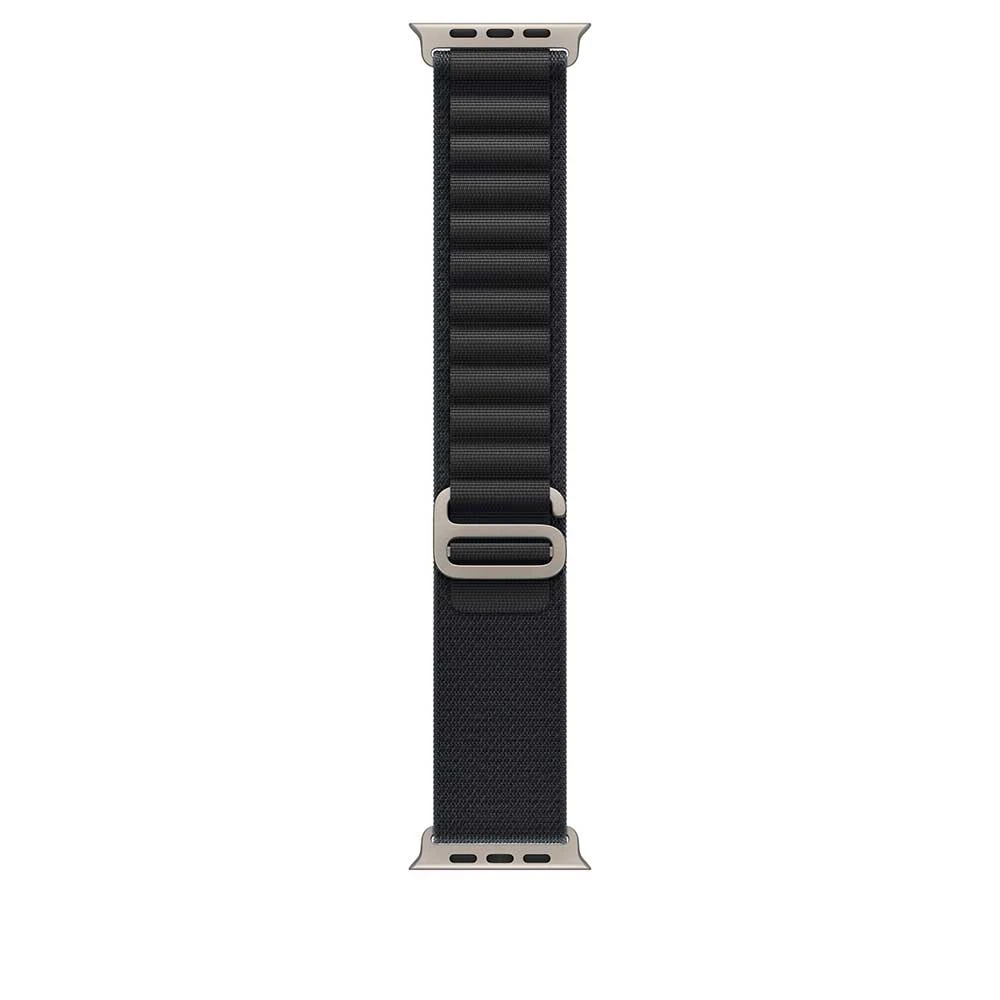 Řemínek Alpský tah k Apple Watch • pevné textilní vrstvy • titanová spona ve tvaru písmene G • spolehlivě drží • velikost pouzdra 49 mm • velikost řemínku Medium (na zápěstí s obvodem 145-190 mm) • barva: černá + kovové prvky z přírodního titanu