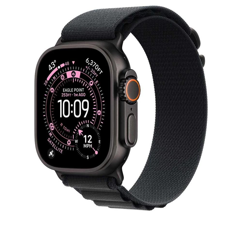 Řemínek Alpský tah k Apple Watch • pevné textilní vrstvy • titanová spona ve tvaru písmene G • spolehlivě drží • velikost pouzdra 49 mm • velikost řemínku Small (na zápěstí s obvodem 130-160 mm) • barva: černá + kovové prvky z černého titanu