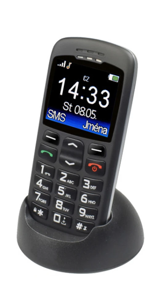 Seniorský tlačítkový telefon s 2,2“ TFT barevným displejem (rozlišení 220 × 176 px) • Zadní fotoaparát 0,3Mpx • Podpora MicroSD do 512GB • SOS tlačítko • LED svítilna • FM rádio • Budík • Záznamník • 3,5mm audio jack • MMS • Konektor USB-C • Bluetooth • Single SIM • Vyměnitelná baterie s kapacitou 900 mAh • Nabíjecí stojánek v balení • Barva: černá