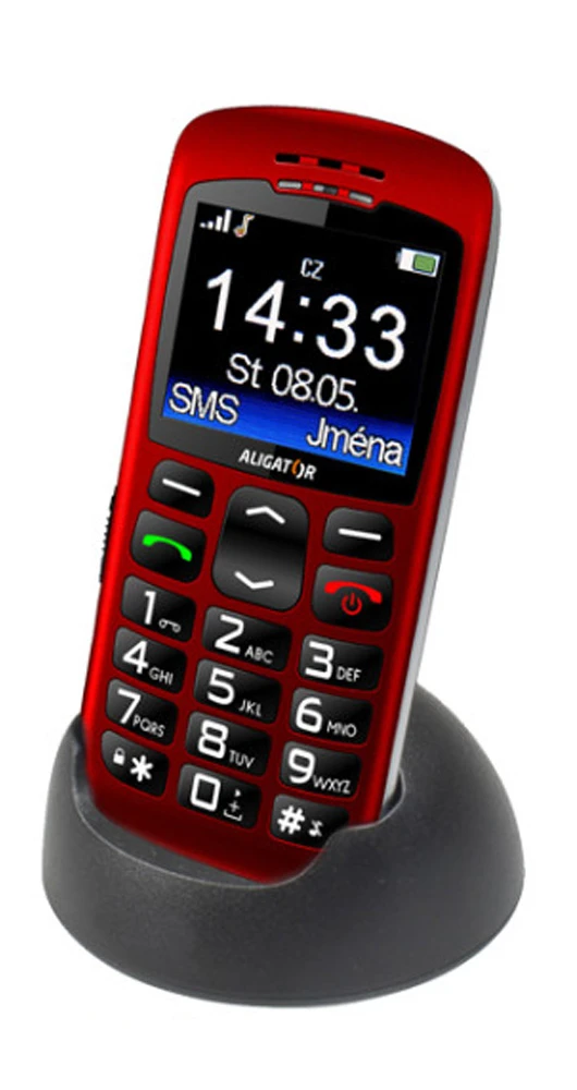Seniorský tlačítkový telefon s 2,2“ TFT barevným displejem (rozlišení 220 × 176 px) • Zadní fotoaparát 0,3Mpx • Podpora MicroSD do 512GB • SOS tlačítko • LED svítilna • FM rádio • Budík • Záznamník • 3,5mm audio jack • MMS • Konektor USB-C • Bluetooth • Single SIM • Vyměnitelná baterie s kapacitou 900 mAh • Nabíjecí stojánek v balení • Barva: červená