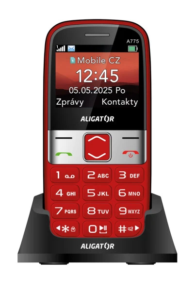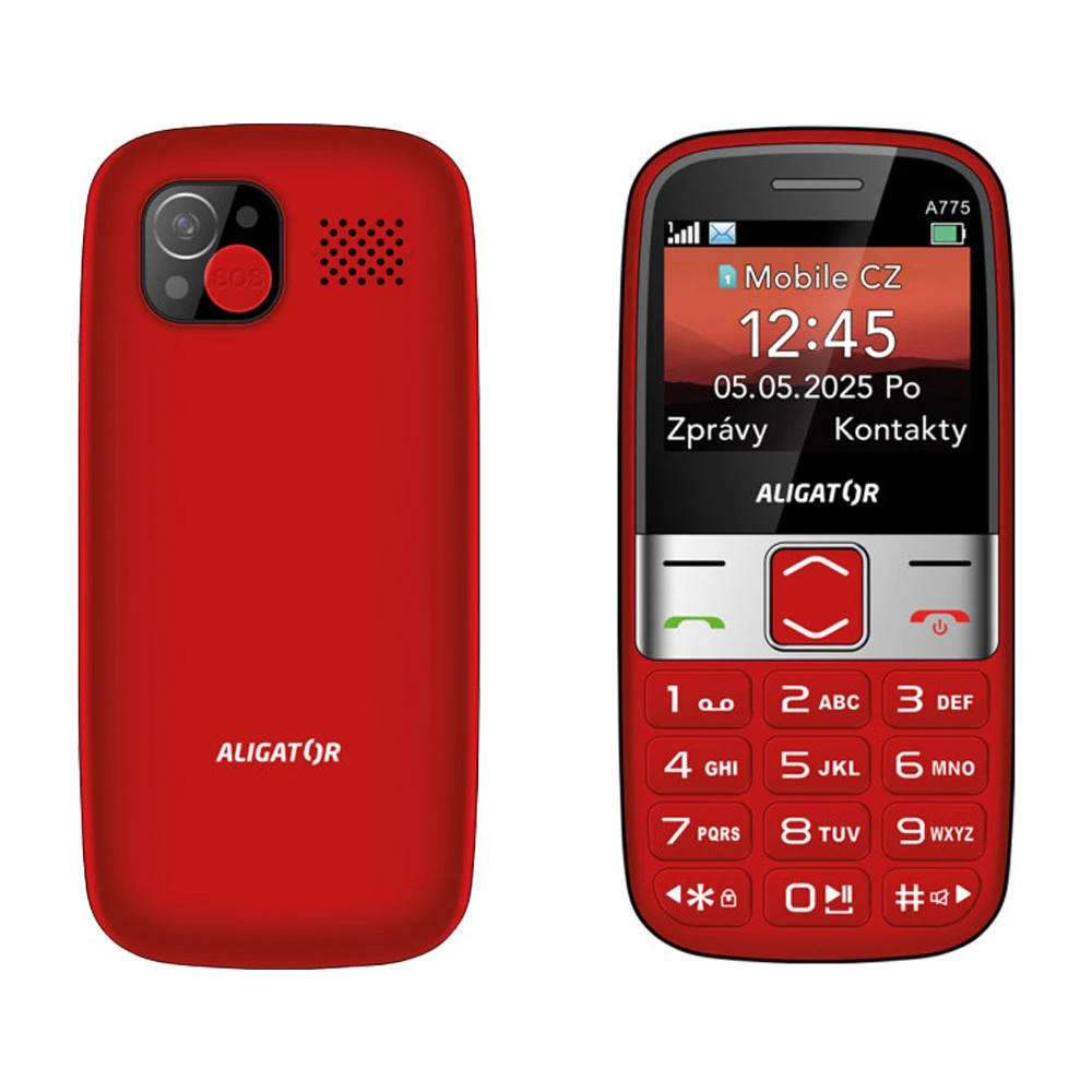 Tlačítkový mobilní telefon s čitelným barevným 2,4" TFT displejem (320 × 240 px) • interní paměť až pro 400 kontaktů a 50 SMS zpráv • podpora microSD/XC karet (až 256GB) • zadní VGA fotoaparát • tísňové tlačítko • SOS lokátor • kalendář • kalkulačka • budík • FM rádio • svítilna • přehrávač hudby a videa • funkce dálkové správy telefonu • Bluetooth 2.1 • GSM • 3.5mm jack • Dual SIM (nano SIM) • 1 700mAh baterie s až 14denní výdrží • včetně nabíjecího stojánku • barva: červená