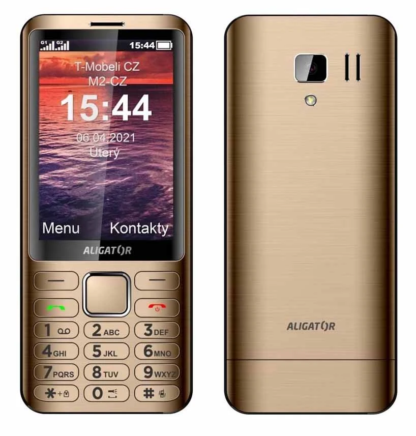 Tlačítkový telefon • 3,5" displej • Dual SIM • ultratenké kovové tělo • klávesnice s oddělenými tlačítky • SOS funkce a SOS lokátor • obrázkové menu • dobře čitelné písmo • kalendář s možností připomínek událostí • multimediální zprávy MMS • kalkulačka • hudební přehrávač • FM rádio • možnost dálkové správy telefonu • Bluetooth • 3,5mm Jack • barva: zlatá