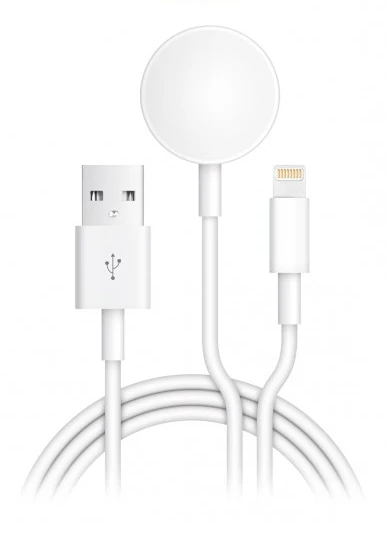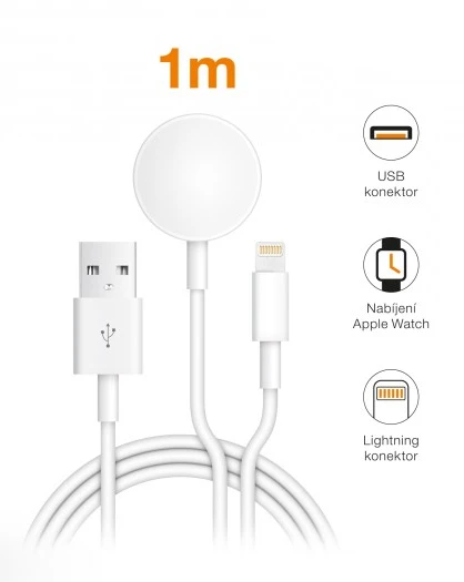 Nabíjecí USB kabel pro iPhone/iPad a Apple Watch 2v1: • Vysoce kvalitní konektory • Možnost rychlého nabíjení 2A • Lightning konektor • Bezdrátové nabíjení pro Apple Watch 2W • Ohebný kabel • Délka: 1m • Barva: bílá