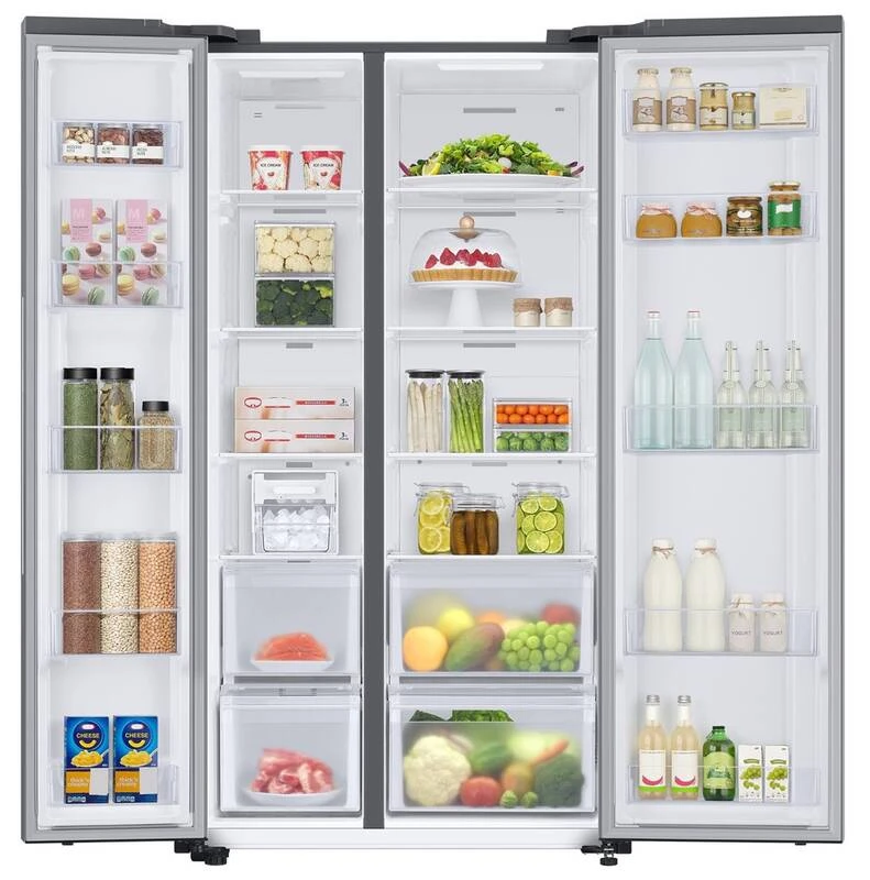 Americká lednice • provedení Side-by-Side • en. třída E • objem 652 l (chladnička 409 l; mrazák 243 l) • 10letá záruka na kompresor • systém True No Frost • Twin Cooling Plus chlazení • flexibilní uložiště se systémem Smart Conversion • rychlé funkce Power Cool a Power Freeze • technologie SpaceMax • režim dovolená • LED osvětlení • klimatická třída: SN, N, ST, T • hlučnost: 36 dB • barva: nerez • výška 178 cm