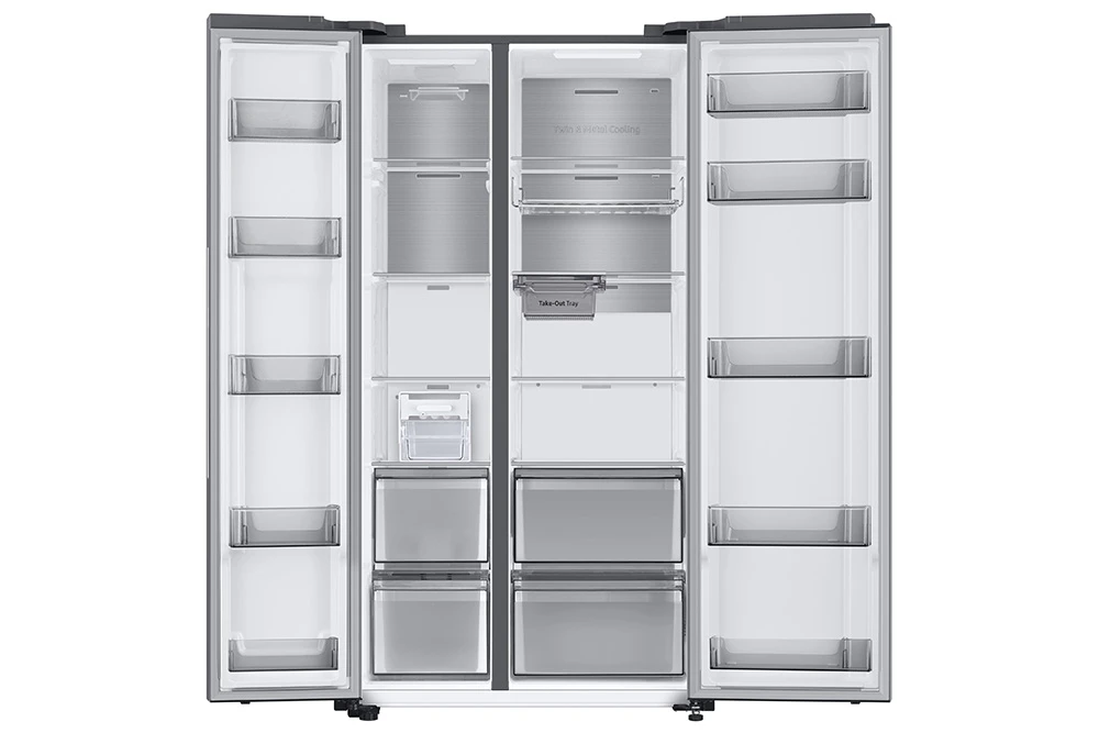 Americká lednice s Wi-Fi • objem: 652 l (chladnička 409 l, mrazák 243 l) • en. třída: C • digitální invertorový kompresor s 20letou zárukou • SmartThings • True No Frost • SpaceMax • systémy Twin Cooling Plus a Metal Cooling • Smart Conversion • funkce Power Cool/Power Freeze • AI Energy mód • police na víno • vnitřní výrobník ledu • klimatická třída: SN, N, ST, T • mrazicí výkon: 16 kg/24 h • hlučnost: 33 dB • barva: nerez