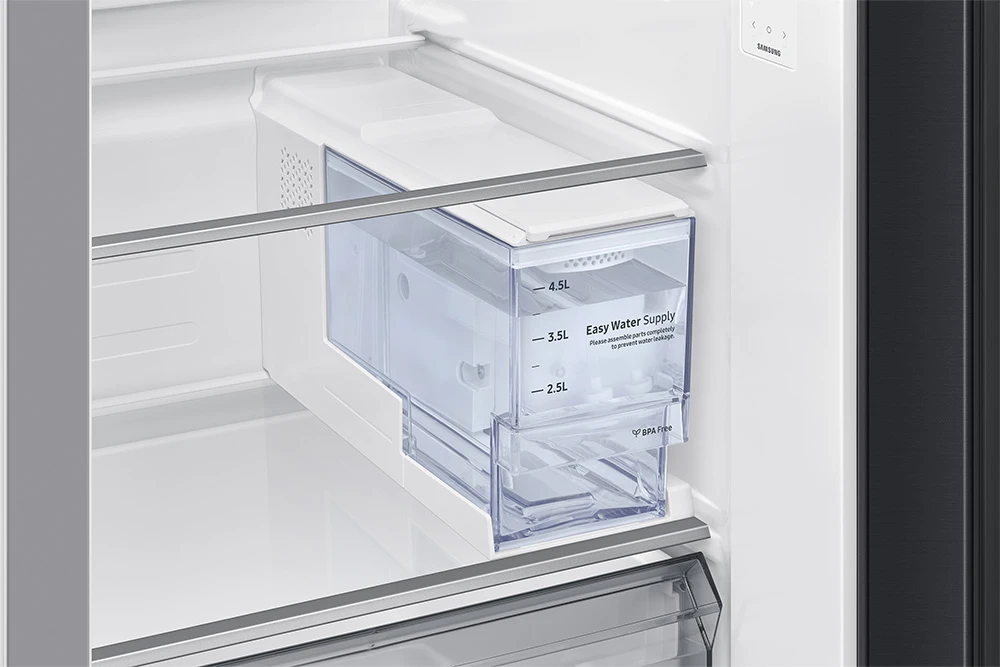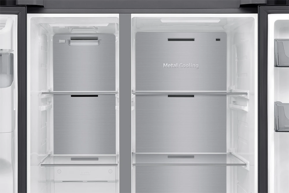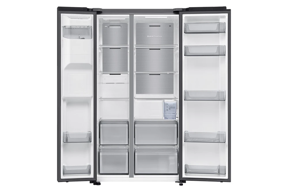 Americká chladnička • energetická třída E • kapacita 640 l (420 / 220) • Mono Cooling • Metal Cooling • invertorový AI kompresor s 20 letou zárukou • technologie SpaceMax • Wi-Fi • AI funkce • dispenzor vody a ledu (bez připojení na vodu) • hlučnost 36 dBA • spotřeba 349 kWh • 13 kg/24h mrazící kapacita • No frost • funkce rychlého chlazení a mrazení • SmartThings aplikace • režim AI Energy • 178 cm výška • barva: černá