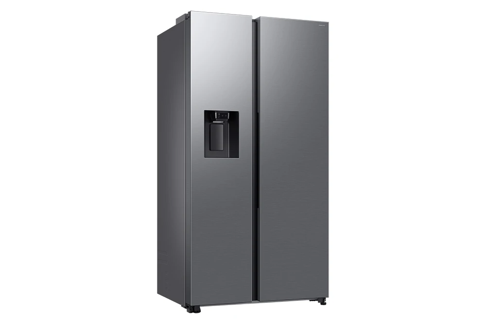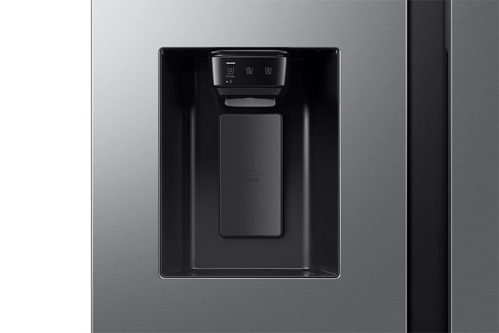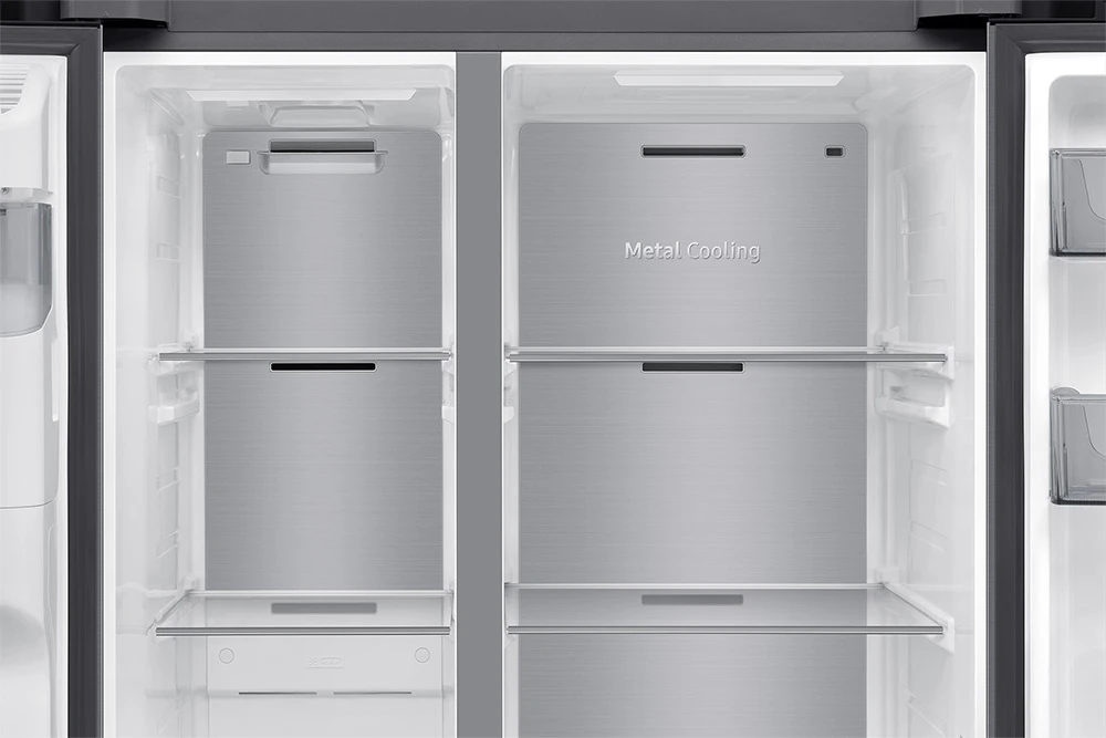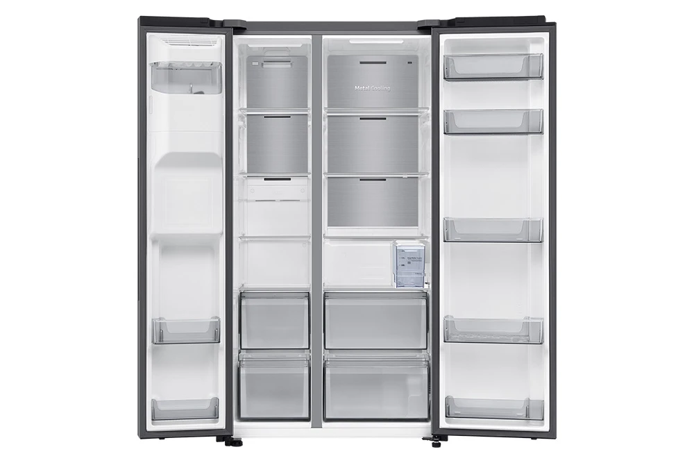 Americká chladnička • energetická třída E • kapacita 640 l (420 / 220) • funkce Mono Cooling • řešení Metal Cooling • Wi-Fi • AI funkce • dispenzor vody a ledu (bez připojení na vodu) • invertorový AI kompresor s 20 letou zárukou • hlučnost 36 dBA • spotřeba 349 kWh • 13 kg/24h mrazící kapacita • technologie No frost • funkce rychlého chlazení a mrazení • 178 cm výška • aplikace SmartThings • barva stříbrná