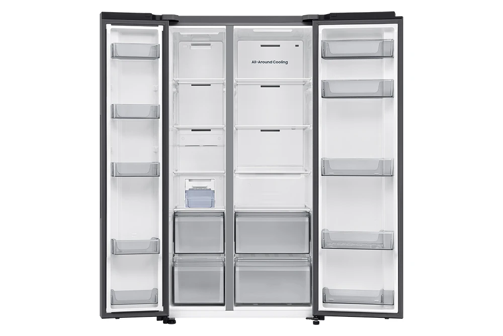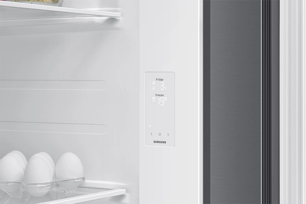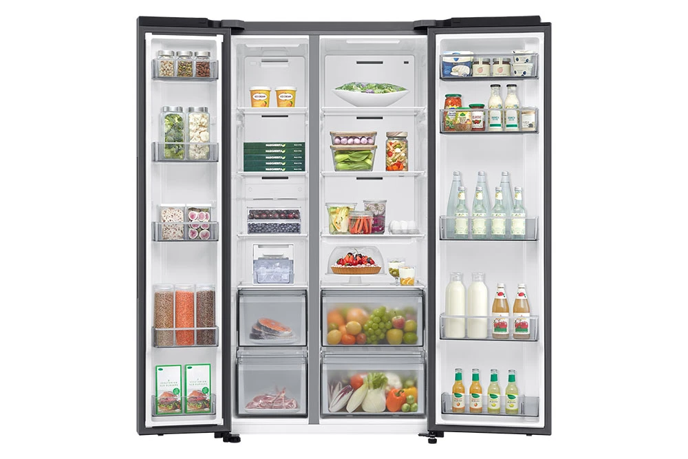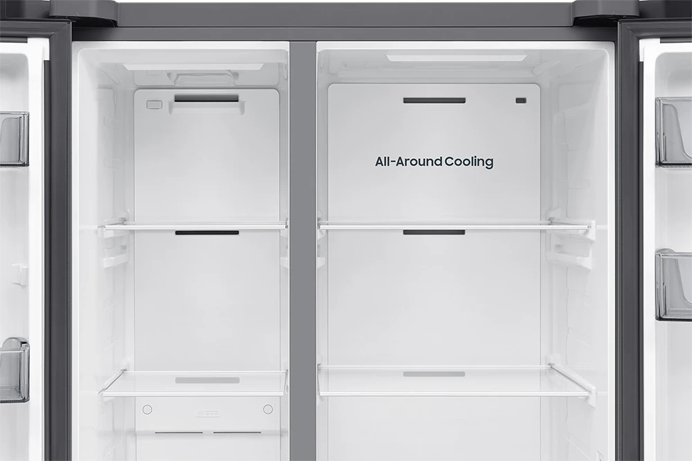 Americká chladnička • energetická třída E • kapacita 635 l • invertorový AI kompresor s 20 letou zárukou • technologie SpaceMax pro více místa • Mono Cooling • Wi-Fi • AI funkce • bez dispenzoru vody a ledu • hlučnost 36 dBA • spotřeba 364 kWh •14 kg/24h mrazící kapacita • přihrádka Big Vegi Box • technologie No frost • funkce rychlého chlazení a mrazení • aplikace SmartThings • režim AI Energy • 178 cm výška • barva stříbrná