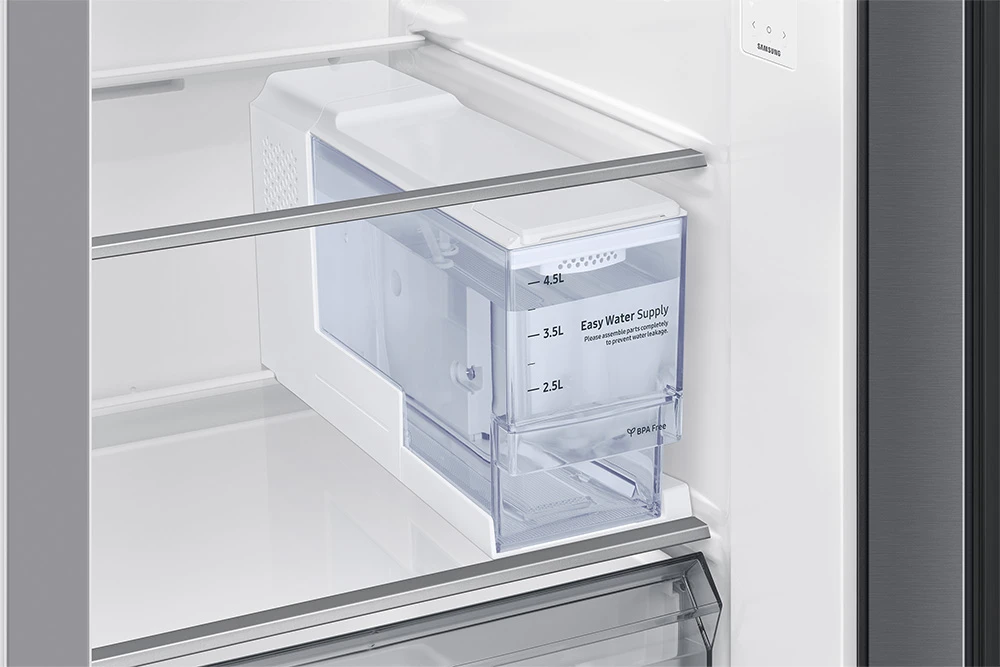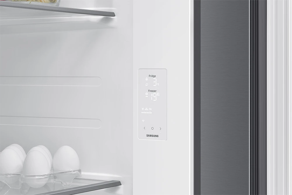 Energetická třída C, Kapacita 634 l (409 / 225), Twin Cooling, Metal Cooling, No Frost, dispenzor vody a ledu, bez připojení na vodu, Automatické otevírání dveří, funkce rychlé chlazení a mrazení, hlučnost 33 dBA, spotřeba 226 kWh/ročně, mrazící kapacita 13 kg/24h, WiFi, AI, Smart, ovládání hlasem (AJ), výška 178 cm, barva stříbrná