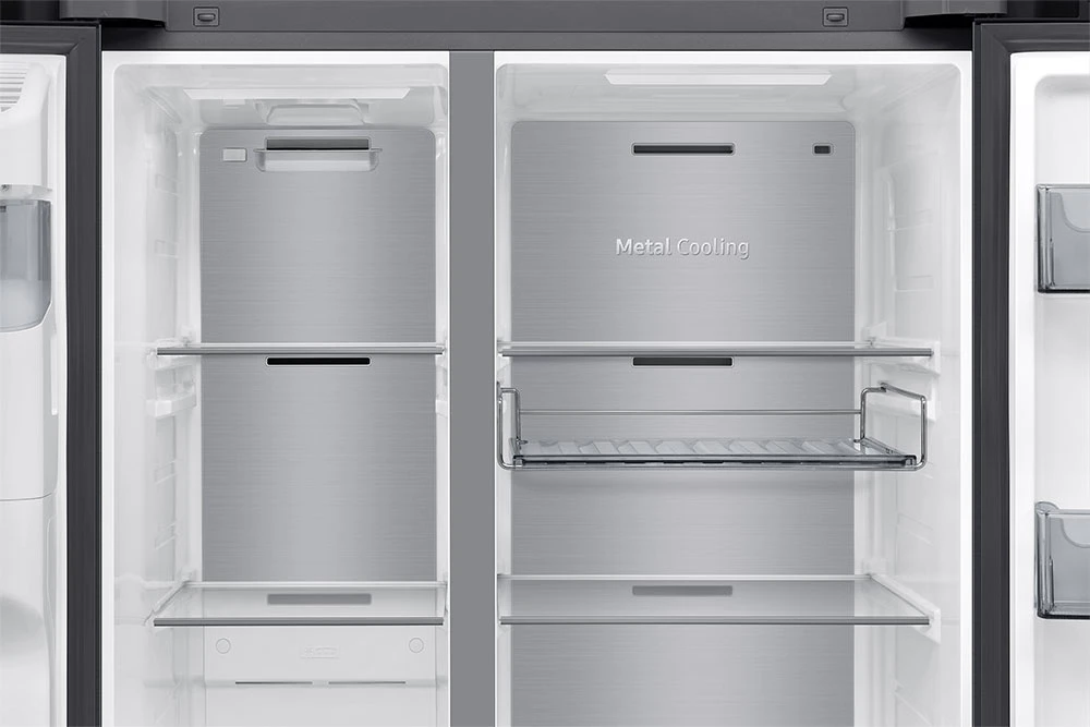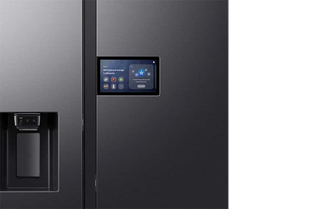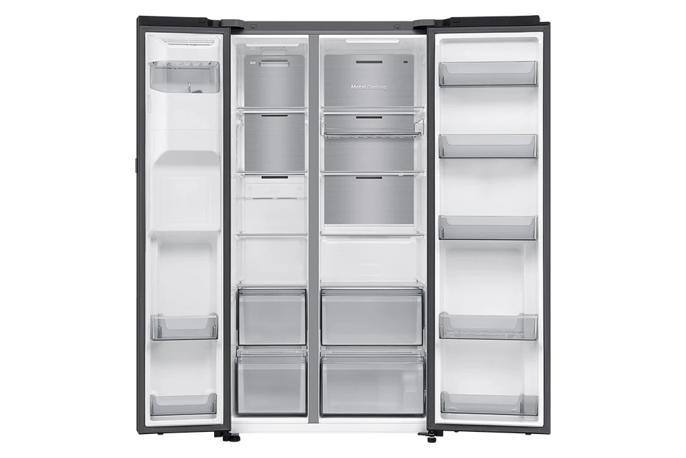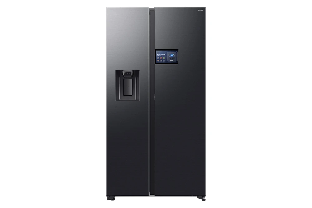 Americká chladnička • energetická třída E • kapacita 621 l (401 / 220) • Mono Cooling • Metal Cooling • 9" LCD AI HOME displej • automatické otevírání dveří • technologie No frost • funkce rychlého chlazení a mrazení • Wi-Fi • AI funkce • dispenzor vody a ledu • připojení na vodovod • hlasitost 36 dBA • spotřeba 348 kWh • vnitřní kamera • hlasové ovládání přes Bixby (pouze anglicky) • 13 kg/24h mrazící kapacita •178 cm výška • barva černá