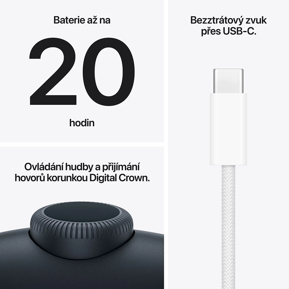 High-endová bezdrátová sluchátka přes hlavu • Špičkové aktivní potlačení hluku (ANC) nová generace nabízí výrazně účinnější izolaci okolního hluku pro nerušený poslech • Čip Apple H2 zajišťuje vyšší výkon, lepší zpracování zvuku a pokročilé chytré funkce • Lossless audio přes USB-C možnost poslechu ve vysokém rozlišení (24-bit / 48 kHz) při kabelovém připojení • Bluetooth 5.3 • Výdrž baterie až 20 hodin • Barva: černá
