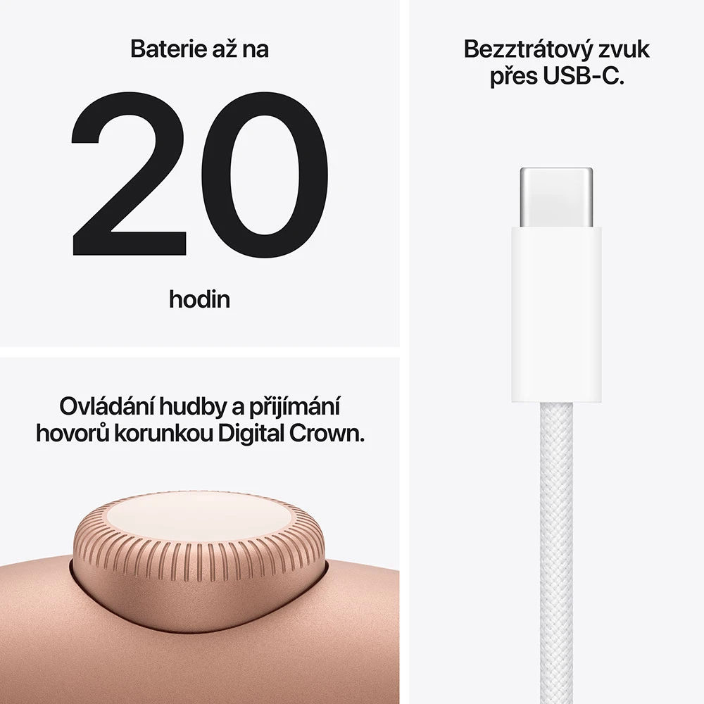 High-endová bezdrátová sluchátka přes hlavu • Špičkové aktivní potlačení hluku (ANC) nová generace nabízí výrazně účinnější izolaci okolního hluku pro nerušený poslech • Čip Apple H2 zajišťuje vyšší výkon, lepší zpracování zvuku a pokročilé chytré funkce • Lossless audio přes USB-C možnost poslechu ve vysokém rozlišení (24-bit / 48 kHz) při kabelovém připojení • Bluetooth 5.3 • Výdrž baterie až 20 hodin • Barva: oranžová