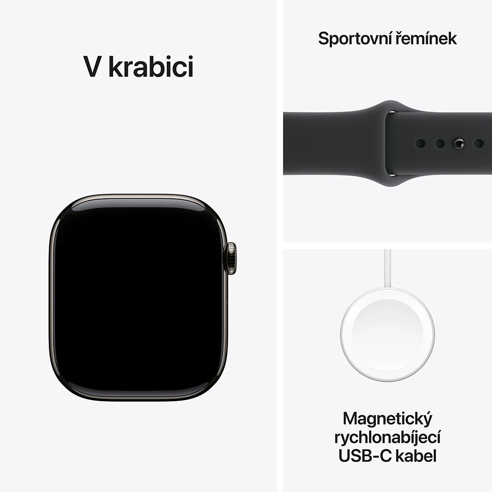 • Apple Watch Series 11 • Řemínek • Magnetická rychlonabíječka Apple Watch s USB‑C kabelem (1m) •