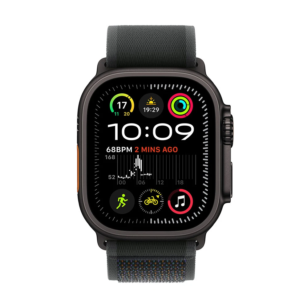 Apple Watch Ultra 2 (2024) • stále zapnutý OLED Retina displej (jas až 3 000 nitů) • čip SiP S9 • 49mm titanové černé pouzdro • sportovní a fitness režimy • potápění • EKG • saturace krve kyslíkem • snímání tepové frekvence i teploty • monitorování srdečního rytmu, kardiovaskulární kondice i spánku • sledování duševního stavu i cyklu • detekce pádu a autonehody • siréna • svítilna • GPS • Wi-Fi • Bluetooth 5.3 • voděodolnost • výdrž až 72 h • řemínek Trailový tah