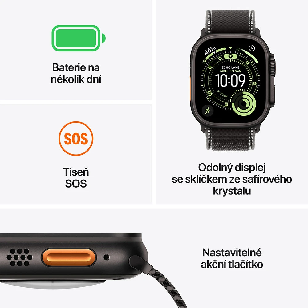 Apple Watch Ultra 3 (2025) • stále zapnutý LTPO3 OLED Retina displej (jas až 3 000 nitů) • safírové sklo • čip Apple S10 • 49mm titanové černé pouzdro • sportovní a fitness režimy • potápění • EKG • saturace krve kyslíkem • snímání tepové frekvence i teploty • monitorování srdečního rytmu, kardiovaskulární kondice i spánku • sledování duševního stavu i cyklu • detekce pádu a autonehody • siréna • SOS satelitní komunikace • 5G • Wi-Fi • BT 5.3 • GPS • 10 ATM • IP6X • výdrž až 72 h