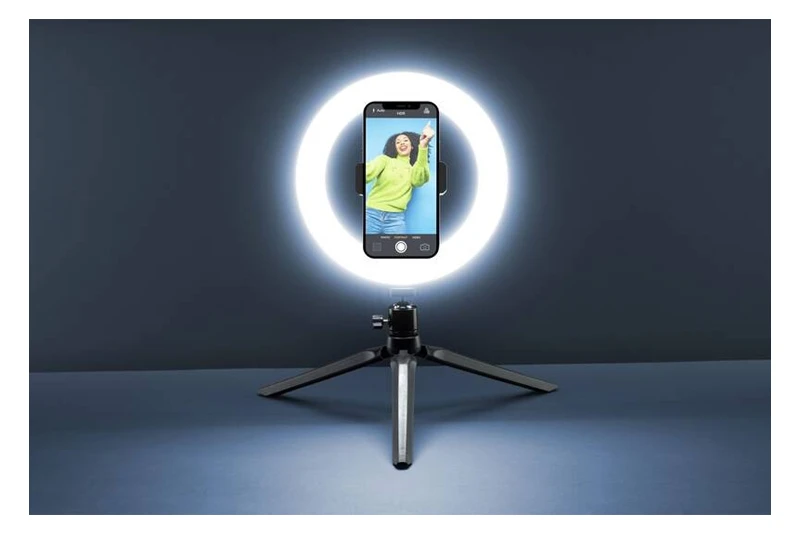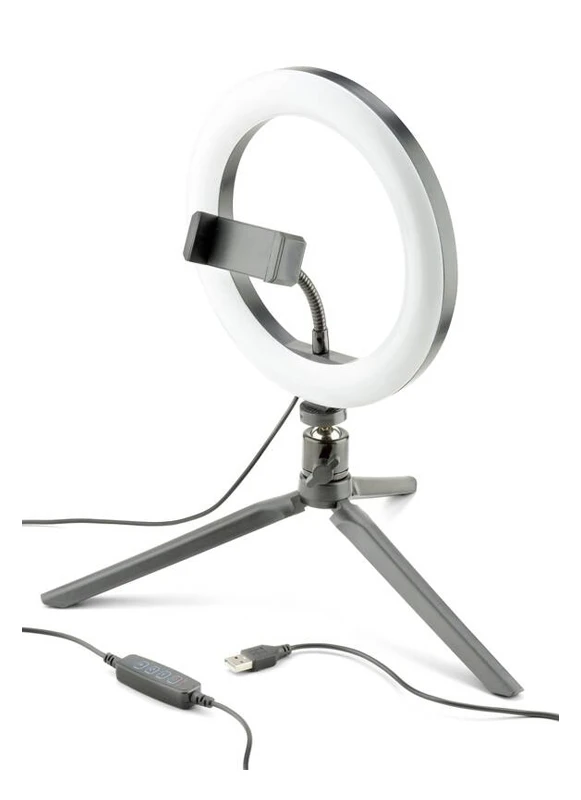 Selfie tripod s efektním LED osvětlením • kompatibilní se všemi telefony o šířce 5,8-8,5 cm • 3 nastavitelné režimy osvětlení • dálkové ovládání pro zapínání, změnu režimu svícení & kontrolu barevnosti • hlava držáku otočná v rozsahu 360° • skvěle přenositelný • Ø světelného prstence: 8" • barevnost světla: 3000-6500 K • výkon diody: 14,4 W • nabíjení pomocí microUSB kabelu (je v balení)