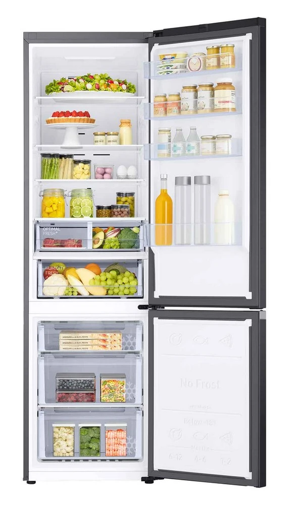 Kombinovaná lednice s mrazákem dole • en. třída B • objem 387 l (chladnička 273 l; mrazák 114 l) • 20letá záruka na kompresor • True No Frost • SpaceMax • chlazení Twin Cooling • Cool Select+ • rychlé funkce Power Cool a Power Freeze • unikátní zásuvky Optimal Fresh+ a Humidity Fresh • zadní design Clean Back • zapuštěné dveře • LED osvětlení • klimatická třída: SN, N, ST, T • hlučnost: 35 dB • rozměry: 203 × 59,5 × 65,8 cm (v × š × h) • barva: černý nerez