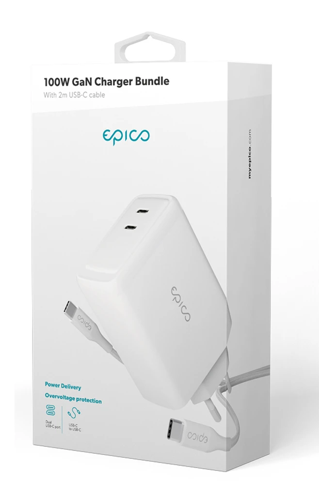 Epico GaN 100W Nabíječka 2xUSB-C+USB-C kabel Bílá