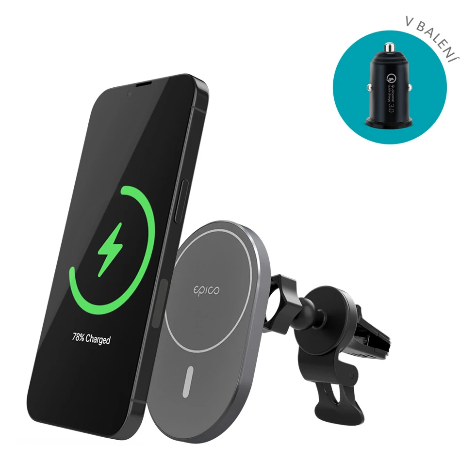 Nabíječka pro iPhone s podporou Apple MagSafe•max nabíjecí výkon 15W•spolehlivé a pevné uchycení do mřížky ventilace se zajištěním•vyrobené ze slitiny hliníku a ABS plastu•kulový kloub pro natočení do ideální pozice•vstup USB-C•v balení kabel USB