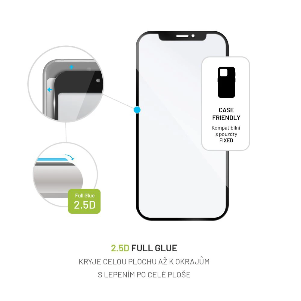 Kvalitní tvrzené sklo FIXED Full-Cover s lepením po celé ploše zajistí maximální ochranu displeje vašeho mobilního telefonu. Zabráníte tak případnému poškození v podobě prasklého nebo poškrabaného displeje. Sklo díky 2,5D designu kryje celou plochu.