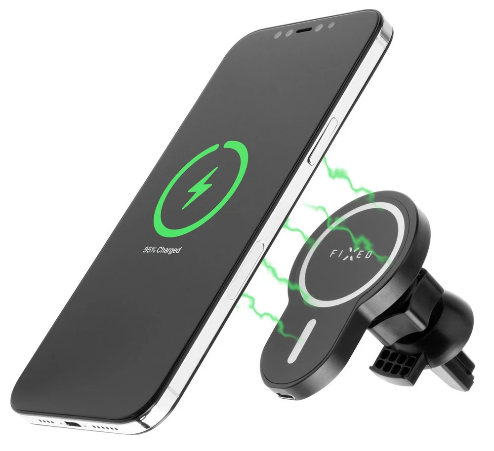 • držák s bezdrátovým nabíjením • integrované magnety pro MagSafe • ideální doplněk pro Apple iPhone 12 a vyšší • určen pro připevnění do mřížky ventilace automobilu • rychlé nabíjení s výkonem 7,5 W pro iOS a až 15W pro ostatní chytré telefony • minimalistické rozměry • otočný kloub pro nastavení do ideálního pozorovacího úhlu • bezpečně udrží vložený telefon i při sebevětších otřesech • ponechává přístup k ovládacím tlačítkům a konektorům