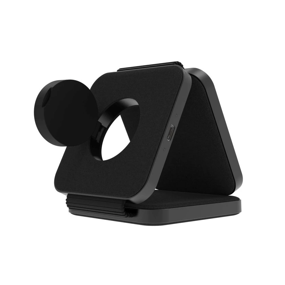 Bezdrátová skládací nabíječka 3v1 s podporou MagSafe • Hlavní nabíjecí plocha pro telefon • Integrovaná vyklápěcí nabíječka pro Apple Watch • Nabíjecí plocha pro bezdrátová sluchátka nebo druhý telefon • Možnost rozložení na nabíjecí podložku či složení do stojánku • Kompaktní skládací provedení - vhodné na cesty • Textilní design se soft-touch prvky