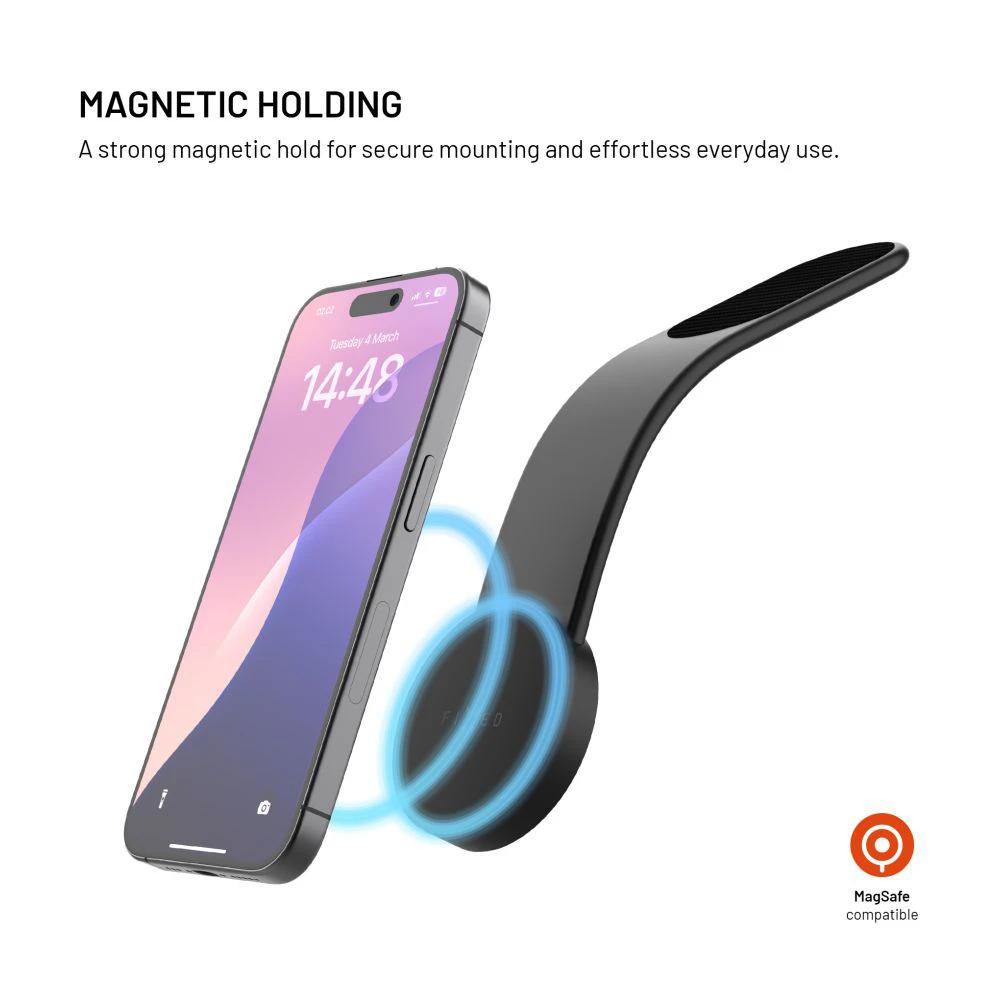 Flexibilní držák FIXED MagFloppy pro uchycení telefonu MagSafe magnety umožňuje snadnou instalaci a široké možnosti použití • Díky suchému zipu upevněnému 3M páskou lze držák umístit na jakoukoli plochu v autě, doma či v kanceláři a flexibilní rameno držáku si nastavit do optimální pozice • Kruhová hlava držáku s MagSafe magnety bezpečně zajistí telefon i během otřesů jízdy, a navíc umožňuje pohodlné otáčení telefonu do vodorovné či svislé polohy pro pohodlné sledování navigace nebo videí.
