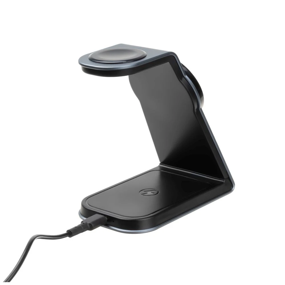 • stojánek pro bezdrátové nabíjení 3v1 s podporou MagSafe • určeno pro nabíjení Apple iPhone (série 12 a vyšší), Apple Watch a bezdrátových sluchátek AirPods • integrovaná nabíječka přímo pro Apple Watch zabudovaná ve stojánku • výkon bezdrátového nabíjení: 7,5W pro iPhone/15W celkem (hlavní nabíjecí plocha) + 3,5W (sekundární nabíjecí plocha) + 2,5W (Apple Watch nabíjecí plocha) • podpora standardu Qi na sekundární nabíjecí ploše pro nabíjení jakýchkoliv TWS sluchátek