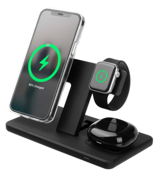 MagSafe stojánek 3v1 s bezdrátovým nabíjením • určený pro nabíjení Apple iPhone (série 12 a vyšší), Apple Watch a Apple Airpods • MagSafe nabíječku lze vyjmout a používat samostatně • výstupní síla bezdrátového nabíjení: 7,5 W pro iPhone/15 W celkem (MagSafe plocha) + 15 W (sekundární plocha) • USB-A konektor 5 W pro připojení nabíječky Apple Watch (nabíječka není součástí balení) • podpora standardu Qi na sekundární nabíjecí ploše • rozměry: 17,5 × 10 × 11 cm • barva: černá