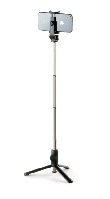 Vlastnosti: kombinace selfie tyče a tripodu, vyrobena z odolné hliníkové slitiny, pro telefony o šířce 5-9cm, 4 teleskopické části ramena s maximální délkou 56cm, odnímatelná Bluetooth dálková spoušť s vyměnitelnou baterií, otočná hlava držáku 360°.