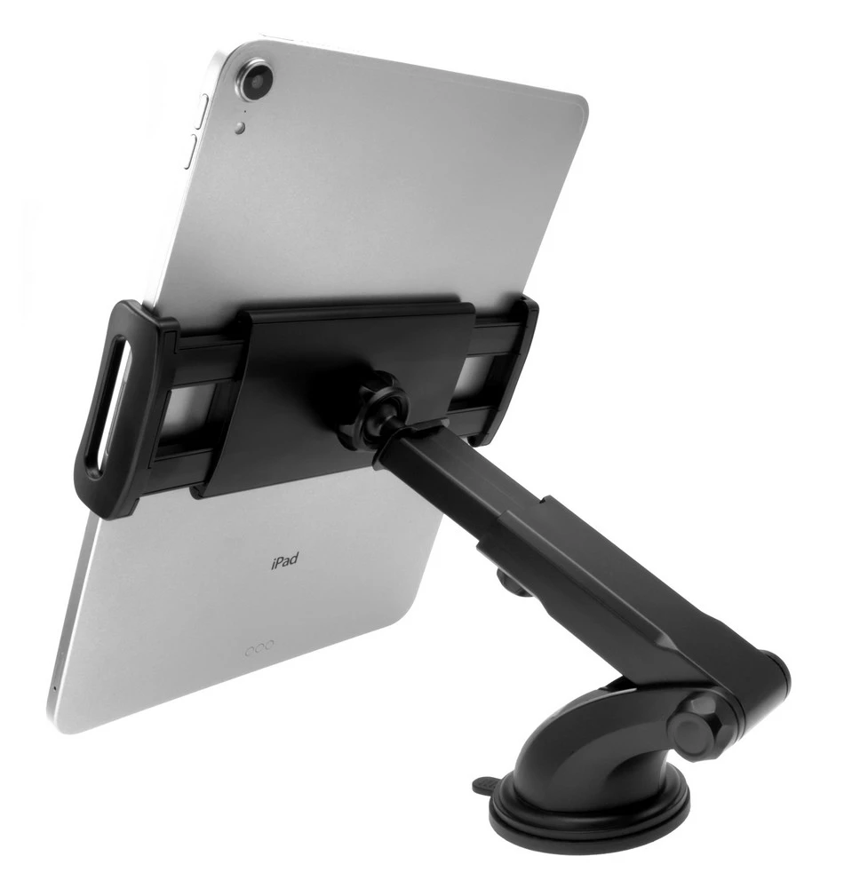 Univerzální držák pro tablet, určen na palubní desku nebo čelní sklo vozu, prodloužené rameno ideální pro MPV, dodávky i kamiony. Určeno pro všechny tablety s úhlopříčkou 7-13", rozevírací kleště s ochranným polstrováním, max. délka ramene 17cm.