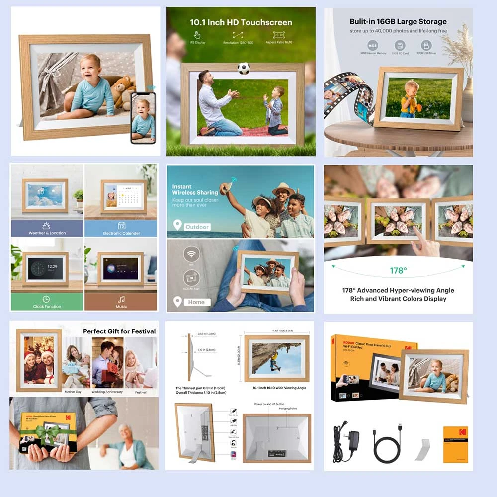 Digitální fotorámeček • 10" IPS dotykový displej (1280x800) • 32GB paměť + 10GB cloud zdarma • Reproduktory • Podpora SD (128GB) a USB (256GB) • Podpora video formátů (MP4, MKV, MOV) a hudebního přehrávání (MP3, OGG, AAC, MP3, FLAC, WAV) • G-senzor • Automatická synchronizace času, kalendáře, hodin a počasí • USB • Jack 3,5mm • Wi-Fi • Pozorovací úhel 178° pro konzistentní barvy • Bezplatná mobilní aplikace KODAK Digital Frame • barva: hnědá (dřevo)