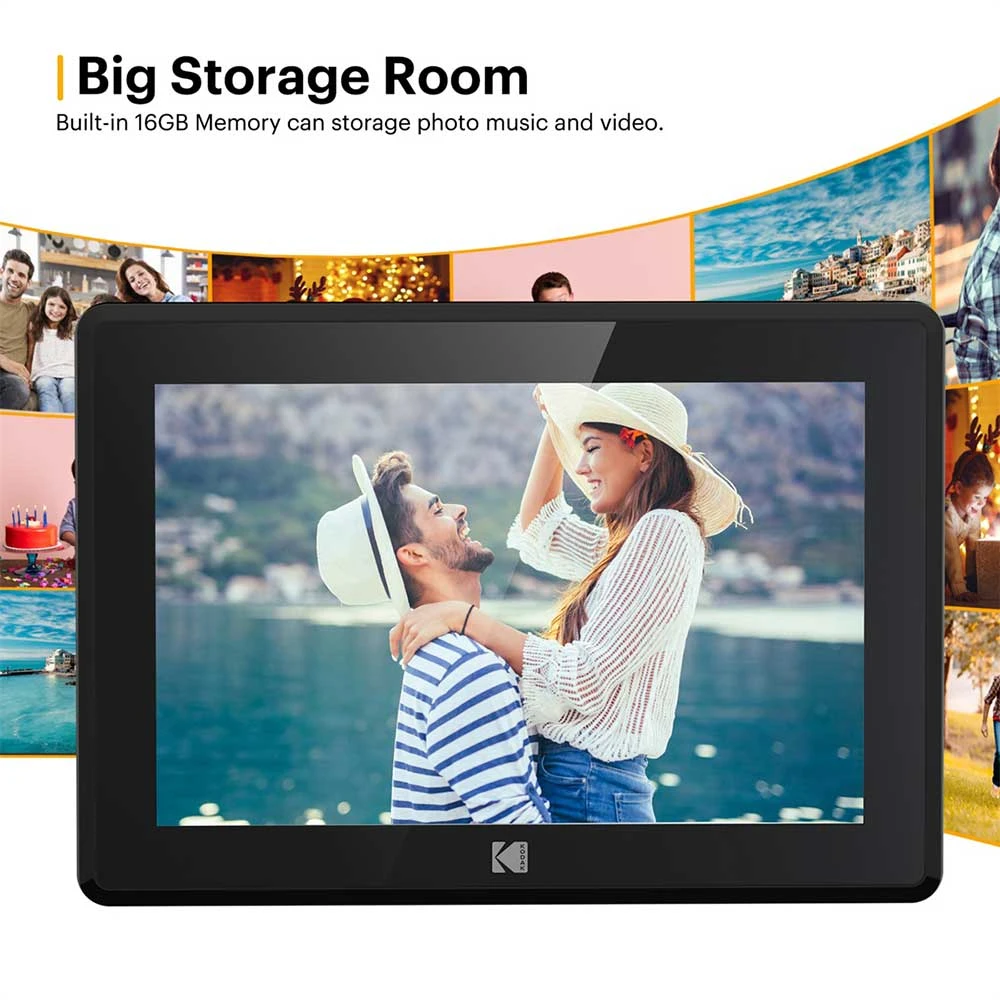 Digitální fotorámeček • 10,1" IPS dotykový displej s rozlišením 1280 × 800 px • široké pozorovací úhly 178° • vestavěná paměť 16 GB + možnost rozšíření (USB / SD karta) • bezdrátové sdílení fotografií a videí přes mobilní aplikaci • podpora formátů foto (JPEG, PNG), video (MP4, MKV, MOV) a hudby • rotace obrazu na výšku/šířku • funkce: kalendář, hodiny, budík, počasí • cloudové úložiště 10 GB • konektivita: Wi-Fi/USB-C • napájení přes adaptér (5 V / 2 A)