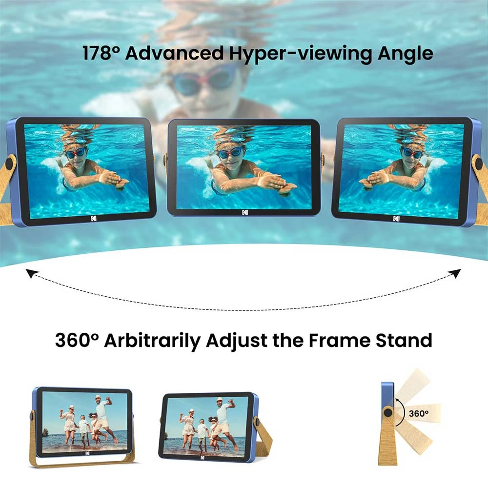 Digitální fotorámeček • 10,1" IPS dotykový displej s rozlišením 1280 × 800 px • široké pozorovací úhly 178° • vestavěná paměť 32 GB + rozšíření přes SD (128 GB), USB (256 GB) • sdílení fotografií a videí přes mobilní aplikaci • 4jádrový procesor + 1 GB RAM • OS Android 8.1 • foto (JPEG/PNG/GIF), video (MP4/MKV/AVI) hudba • stereo reproduktory • automatická rotace obrazu (G-sensor) • doplňkové funkce: kalendář/hodiny/počasí • cloudové úložiště 10 GB • konektivita: USB-C/USB-A/SD • vestavěná bat.