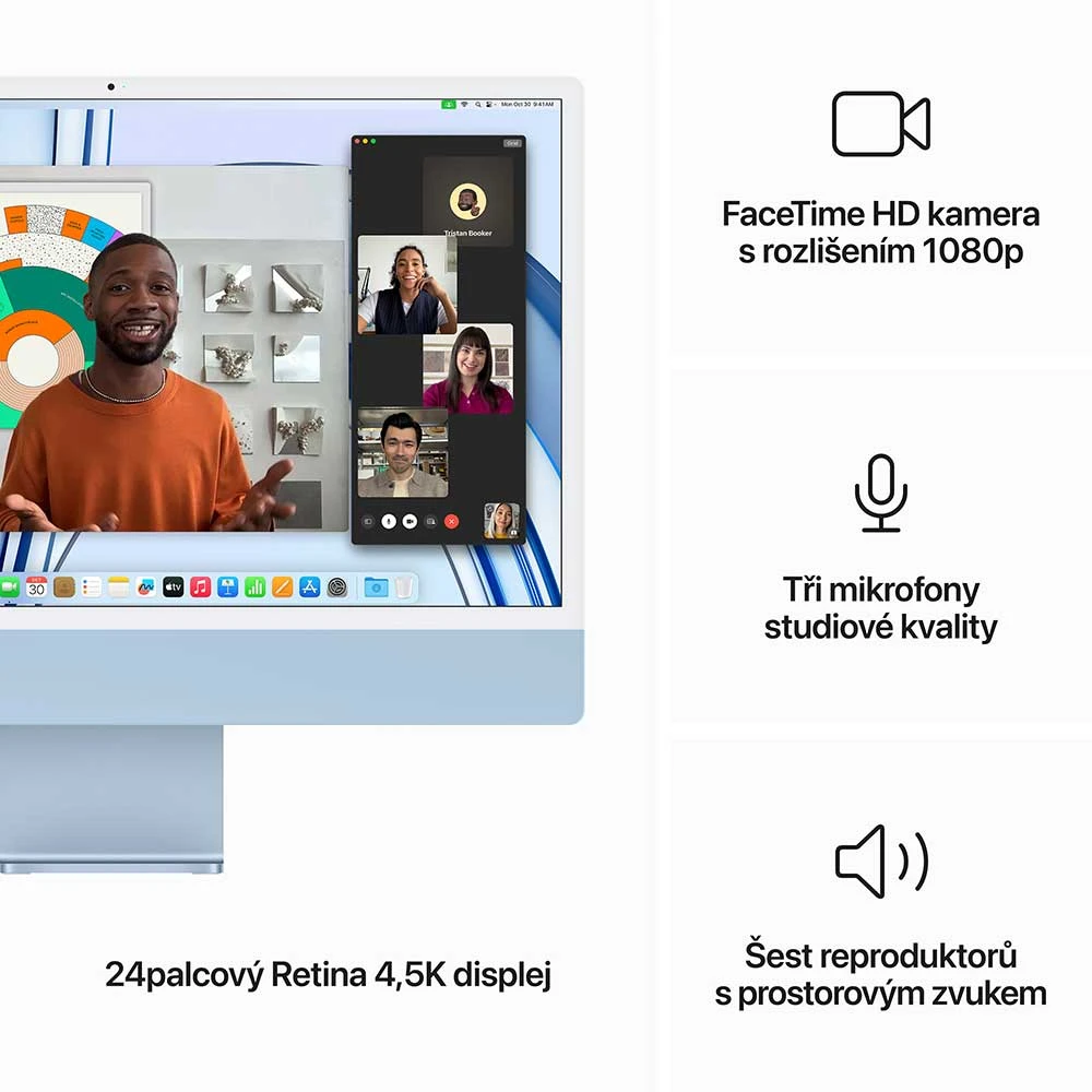 iMac • 24palcový Retina 4,5K displej (4 480 × 2 520 px, 500 nitů, široký barevný rozsah P3, True Tone) • čip Apple M3 – 8jádrové CPU, 10jádrové GPU & 16jádrový Neural Engine • 8GB RAM • 256GB SSD úložiště • Hi‑fi zvuková soustava šesti reproduktorů • tři mikrofony • Magic Keyboard s Touch ID • Magic Mouse • FaceTime HD 1080p kamera • Wi‑Fi 6E • Bluetooth 5.3 • 2× Thunderbolt/USB 4 • 2× USB 3 • gigabitový ethernet • 3,5mm sluchátkový výstup • macOS • barva: modrá