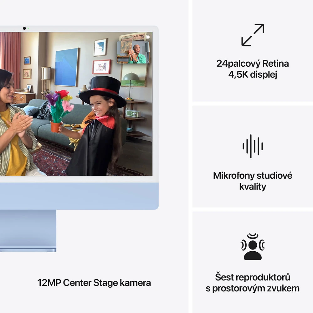 iMac 2024 • 24palcový Retina 4,5K displej (4 480 × 2 520 px, 500 nitů, široký barevný rozsah P3, True Tone) • čip Apple M4 – 10jádrové CPU, 10jádrové GPU & 16jádrový Neural Engine • 16GB RAM • 256GB SSD úložiště • Hi‑fi zvuková soustava šesti reproduktorů • tři mikrofony • Magic Keyboard s Touch ID • Magic Mouse • 12Mpx Center Stage kamera • Wi‑Fi 6E • Bluetooth 5.3 • 4× Thunderbolt 4/USB 4 • 3,5mm sluchátkový konektor • gigabitový ethernet • macOS Sequoia • barva: modrá
