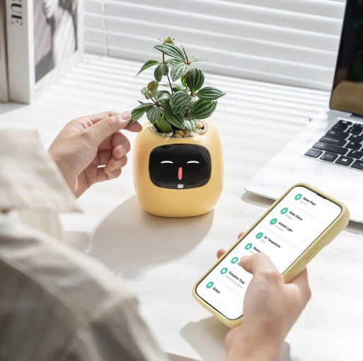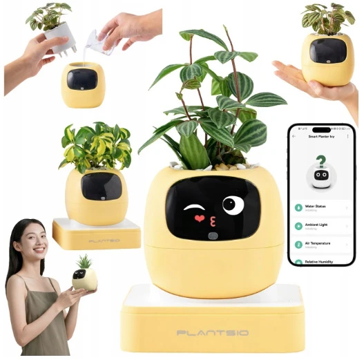 Inteligentní květináč • sleduje stav rostliny pomocí až 7 senzorů (vlhkost půdy, teplota, světlo, hladina vody) • interaktivní displej se zobrazením emocí a více než 70 výrazů pro signalizaci potřeb rostliny • reaguje na dotyk a gesta (až 5 typů interakcí) • upozornění na zálivku a nevhodné podmínky • propojení s mobilní aplikací pro individuální péči o konkrétní typ rostliny • doporučení pěstování a tipy • napájení: baterie/USB-C • design vhodný do interiéru • silikonová protiskluzová základna