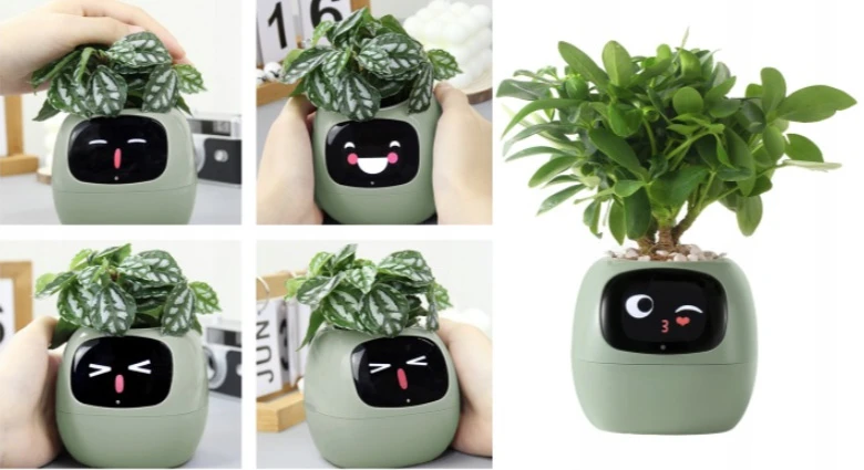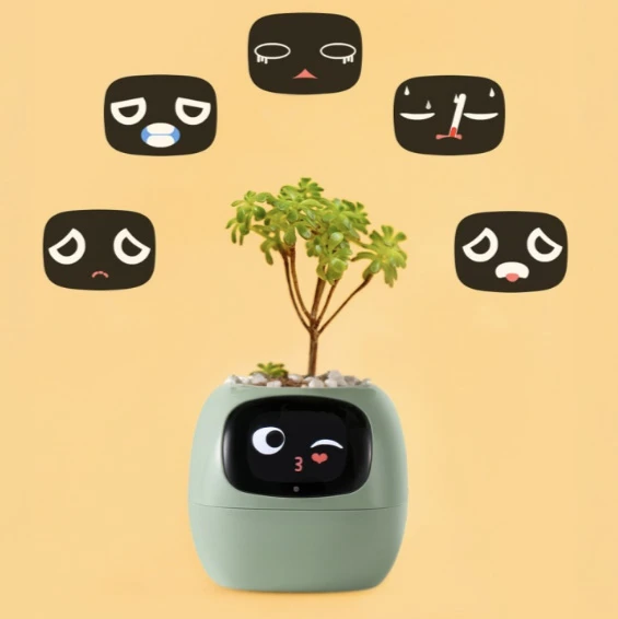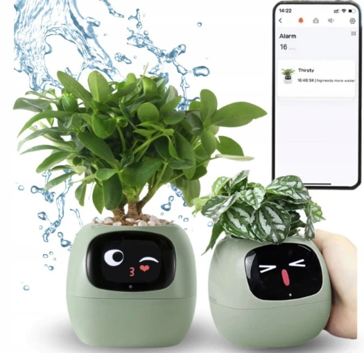 Inteligentní květináč • sleduje stav rostliny v reálném čase pomocí 9 senzory (vlhkost půdy, teplota, světlo, hladina vody, vlhkost vzduchu) • interaktivní displej se zobrazením emocí a více než 100 výrazů • upozornění na zálivku a nevhodné podmínky • propojení s mobilní aplikací Wi-Fi pro monitoring a statistiky • podpora více než 60 druhů rostlin s individuální péčí • technologie PlantSense 2.0 pro přesné vyhodnocení dat • dotykové ovládání a reakce na gesta • napájení USB-C, baterie