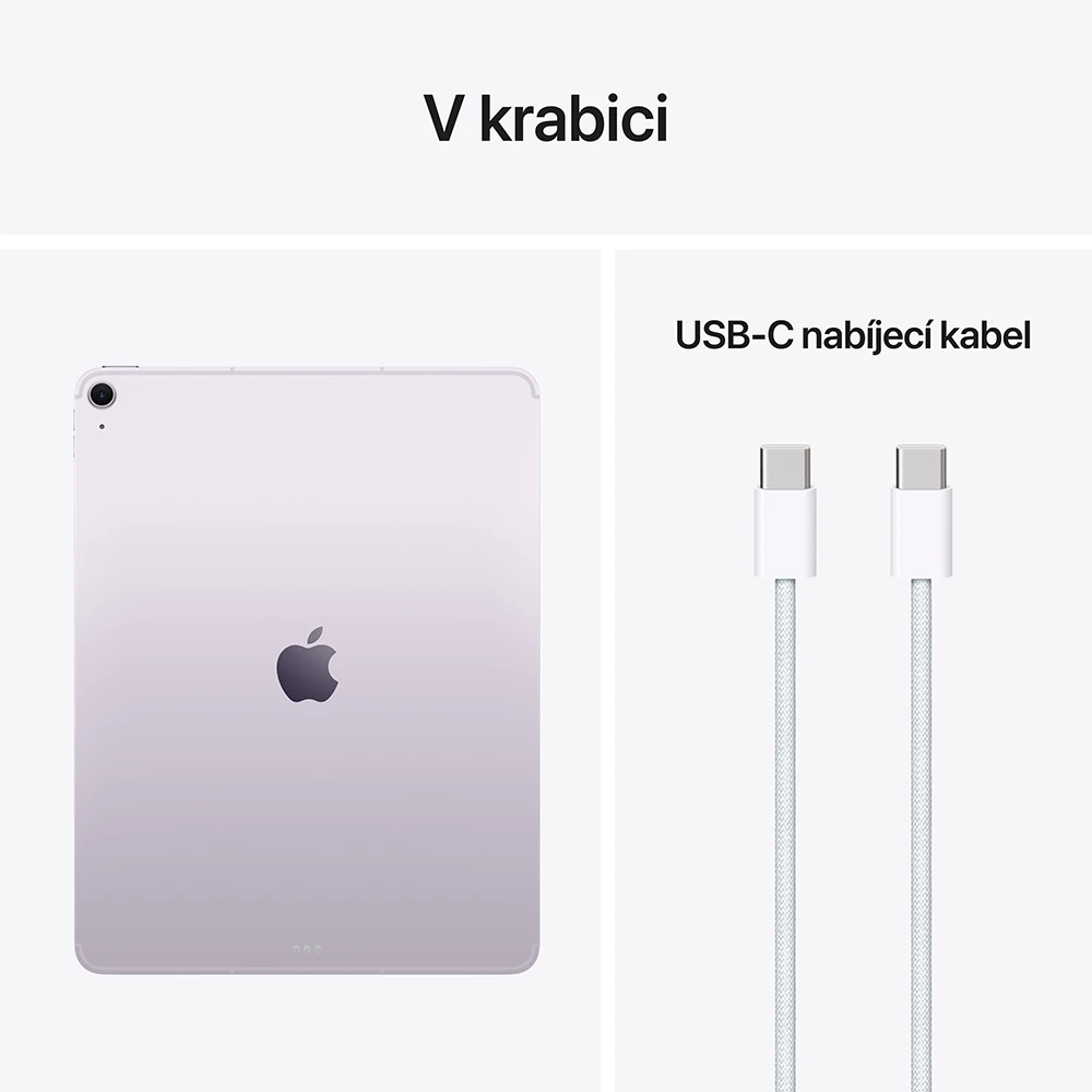 iPad Air 13" 2026 • 13" Liquid Retina displej s LED podsvícením (2 732 × 2 048 px, 600 nitů, True Tone, antireflexní) • čip Apple M4 – 8jádrové CPU, 9jádrové GPU & 16jádrový Neural Engine • 12GB RAM • 128GB úložiště • zadní 12MPx širokoúhlý fotoaparát (f/1,8) • přední 12MPx ultraširokoúhlá kamera (f/2,0) • stereo reproduktory • 2 mikrofony • Touch ID • 5G/LTE • Wi‑Fi 7 • Bluetooth 6.0 • GPS • USB‑C konektor • až 9 h sledování videí na jedno nabití • eSIM • iPadOS 26 • barva: fialová