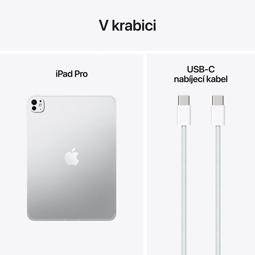 iPad Pro 2025 • 11" Ultra Retina XDR displej (Tandem OLED, 2 420×1 668 px, ProMotion 10-120 Hz, P3, True Tone, až 1600 nitů, antireflexní) • čip Apple M5 – 9jádr. CPU, 10jádr. GPU & 16jádr. Neural Engine • 12GB RAM • 512GB úložiště • zadní 12MPx širokoúhlý fotoap. (f/1,8) • přední 12MPx Center Stage kamera (f/2,0) • 4 repro • 4 mikrofony • Face ID • LiDAR • 5G/LTE (eSIM) • Wi‑Fi 7 • BT 6.0 • Thunderbolt/USB 4 • až 10 h sledování videí na jedno nab. • iPadOS 26 • barva: stříbrná