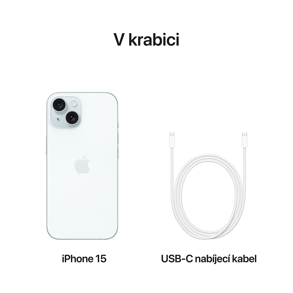 iPhone 15 • 6,1" Super Retina XDR OLED displej (2 556 × 1 179 px, HDR, True Tone, široký barevný rozsah P3, jas až 2 000 nitů, Ceramic Shield) • čip A16 Bionic – 6jádrové CPU, 5jádrové GPU, 16jádrový Neural Engine • 128GB uložiště • dvojice zadních fotoaparátů – 48MPx (f/1,6) + 12MPx (f/2,4) • OIS • přední 12MPx fotoaparát (f/1,9) • stereo reproduktory • Dynamic Island • Face ID • Wi-Fi 6 • 5G • Bluetooth 5.3 • NFC • GPS • USB-C • nano‑SIM/eSIM • rychlé nabíjení • iOS 17 • barva: modrá