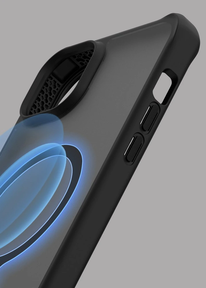 • HYBRID // MAGFROST pouzdro se vyznačuje krásným, kouřovým, matným povrchem s ochranou proti poškrábání. • Tenké, lehké pouzdro je vyrobeno ze 100% recyklovaných materiálů a obsahuje prstenec magnetů integrovaný do pouzdra, takže je kompatibilní s nabíjecími stojany MagSafe a dalším příslušenstvím. • Magnetický kroužek je vložen mezi 2 desky, takže je v jedné rovině s pouzdrem. To zvyšuje odolnost bez ovlivnění pevnosti připevnění, protože magnety jsou 2x silnější než u konkurence.