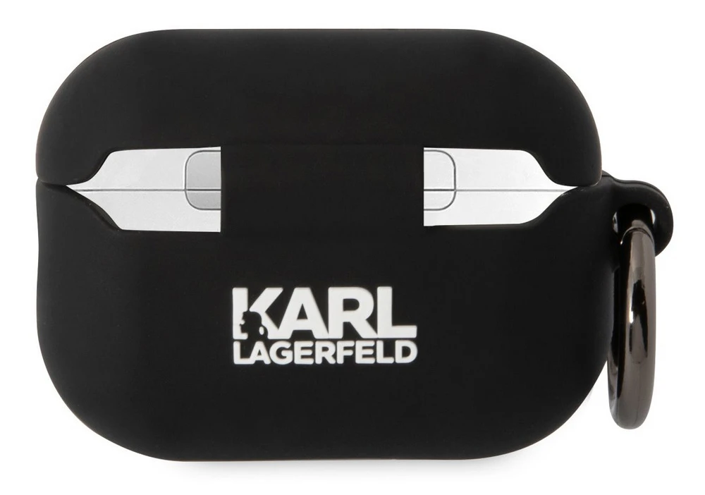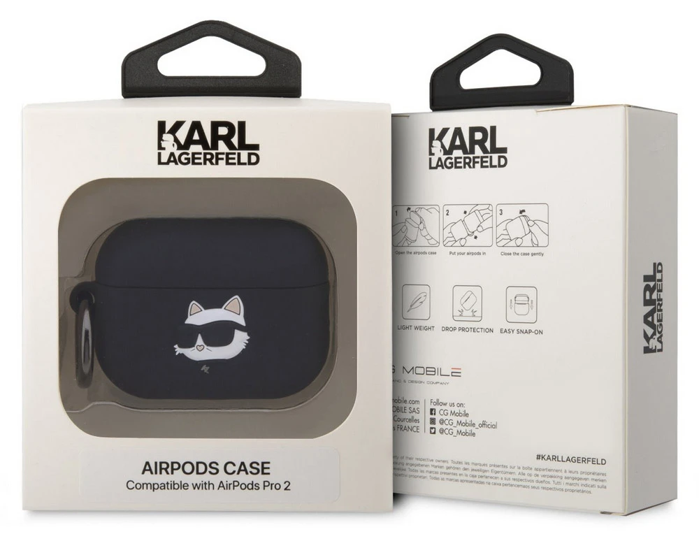 Ochranné pouzdro pro Apple AirPods Pro2 • NFT logo Karl Lagerfeld • vyrobeno z prvotřídního silikonu • vyobrazení kočky Choupette • poutko s kovovou karabinou • výřez pro nabíječku • skládá se ze dvou částí • perfektní a přesné zpracování • černá barva