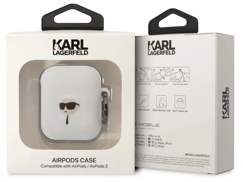Originální značkový kryt Karl Lagerfeld pro Apple AirPods 1. i 2. generace • vysoká odolnost • skvělá povrchová ochrana • tenké zpracování • prvotřídní silikon • povrch je příjemný a dobře se drží v ruce • elegantní design, skvělý módní doplněk • bílá barva • plastické logo Karl Lagerfeld • praktický kroužek pro připevnění