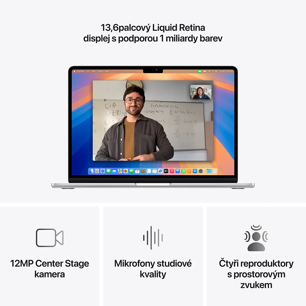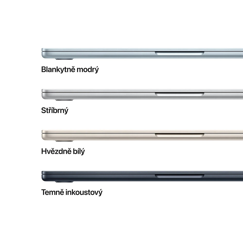 MacBook Air 13 2025 • 13,6" IPS Liquid Retina displej s LED podsvícením (2 560 × 1 664 px, 500 nitů) • technologie True Tone • široký barevný rozsah P3 • čip Apple M4 (10jádrové CPU, 10jádrové GPU, 16jádrový Neural Engine) • 16GB RAM • 512GB SSD úložiště • 4 reproduktory • 3 mikrofony • podsvícená Magic Keyboard • Touch ID • 1080p FaceTime HD kamera • Wi-Fi 6E • Bluetooth 5.3 • MagSafe 3 • 2 porty Thunderbolt / USB 4 • 3.5mm konektor • až 18h výdrž na baterii