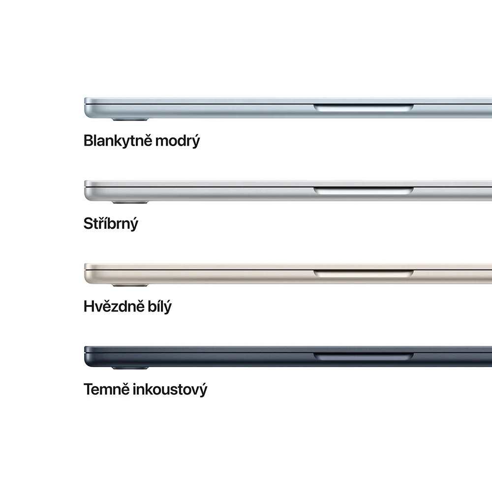 MacBook Air 13 2025 • 13,6" IPS Liquid Retina displej s LED podsvícením (2 560 × 1 664 px, 500 nitů) • technologie True Tone • široký barevný rozsah P3 • čip Apple M4 (10jádrové CPU, 8jádrové GPU, 16jádrový Neural Engine) • 16GB RAM • 256GB SSD úložiště • 4 reproduktory • 3 mikrofony • podsvícená Magic Keyboard • Touch ID • 1080p FaceTime HD kamera • Wi-Fi 6E • Bluetooth 5.3 • MagSafe 3 • 2 porty Thunderbolt / USB 4 • 3.5mm konektor • až 18h výdrž na baterii