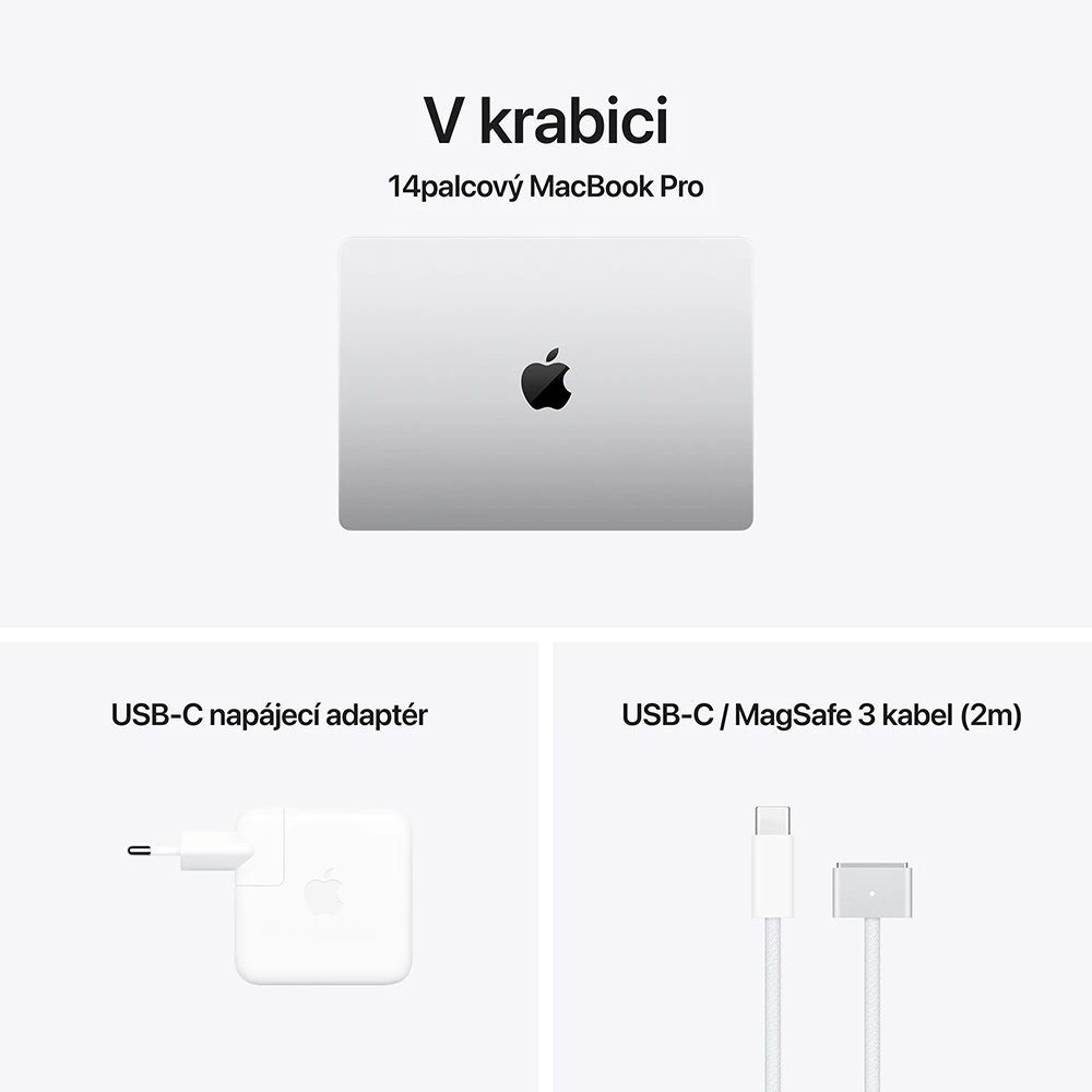 • 14palcový MacBook Pro • 96W USB‑C napájecí adaptér • USB‑C / MagSafe 3 kabel (2 m) •