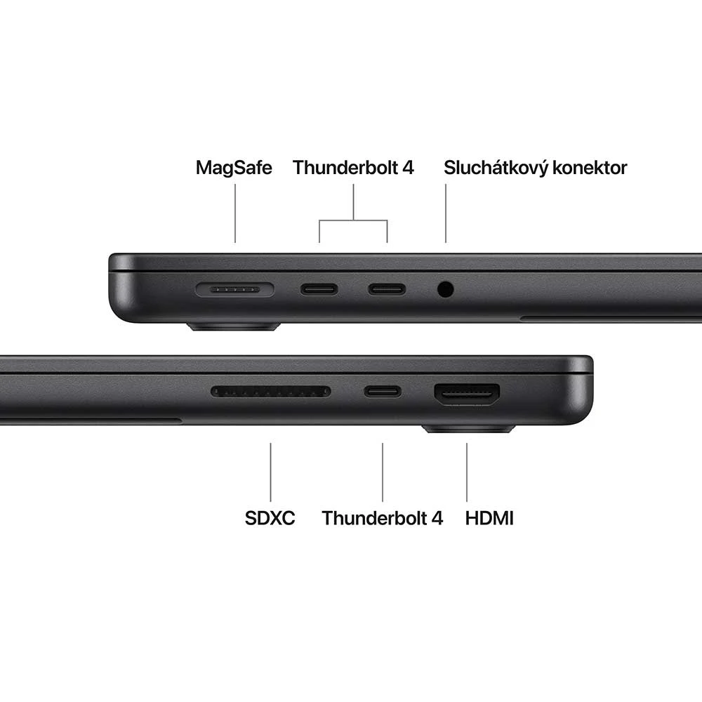 MacBook Pro 2025 • 14,2" Liquid Retina XDR displej (3 024 × 1 964 px,až 1 600 nitů,P3, ProMotion – až 120 Hz) • čip Apple M5 – 10jádr. CPU, 10jádr. GPU & 16jádr. Neural Engine • 24GB RAM • 1TB SSD úložiště •Hi‑fi zvuková soustava šesti reproduktorů • 3 mikrofony •podsvícená Magic Keyboard • Touch ID • 12Mpx Center Stage kamera • Wi‑Fi 6E • Bluetooth 5.3 • 3× Thunderbolt 4 (USB-C)/USB 4 • SDXC slot • HDMI • 3,5mm konektor •MagSafe 3 • macOS Sequoia • až 24h výdrž na bat. • barva: vesmírně černá