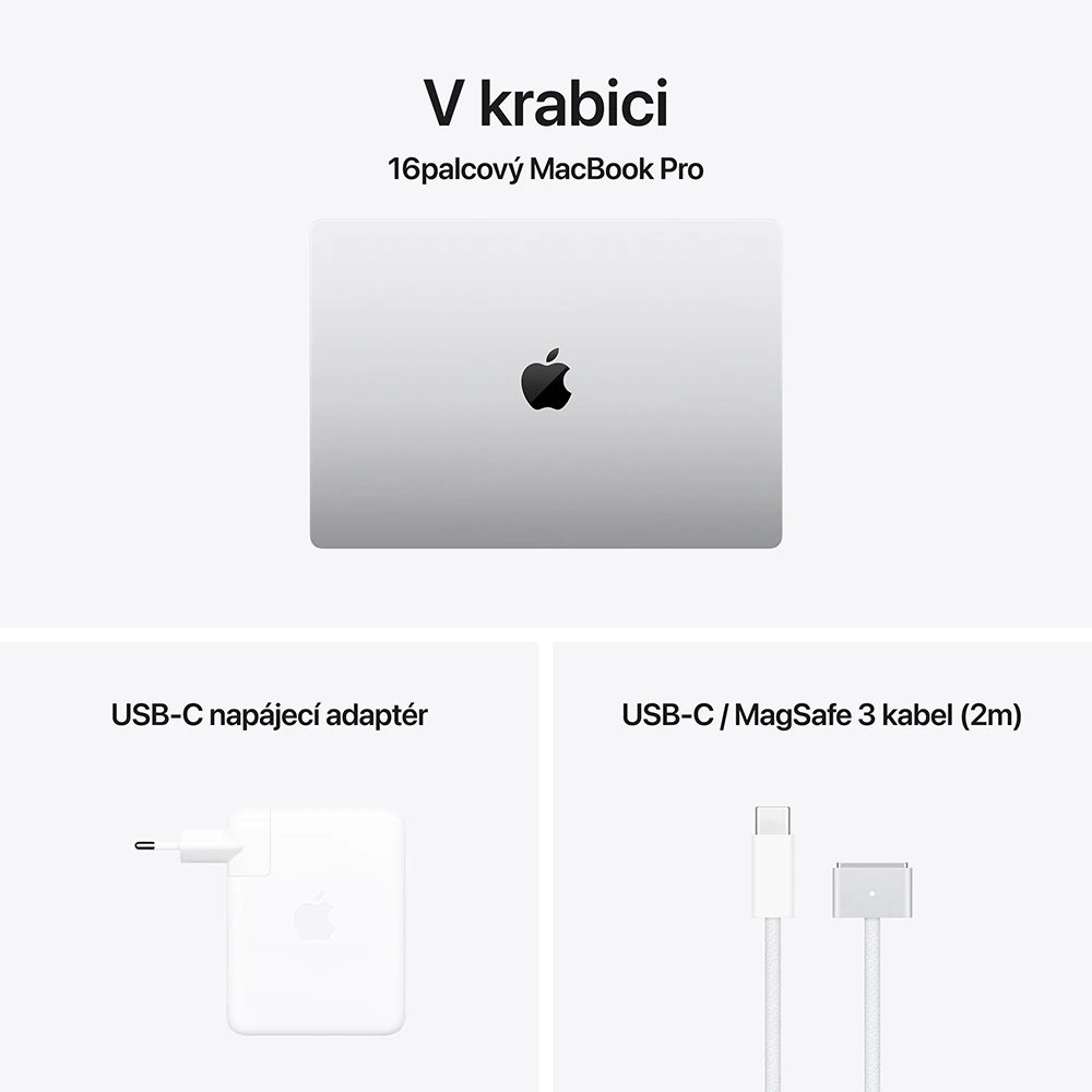 • 16palcový MacBook Pro • 140W USB‑C napájecí adaptér • USB‑C / MagSafe 3 kabel (2 m) •