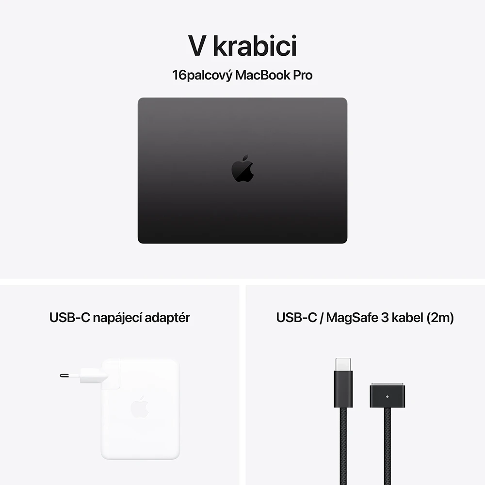 • 16palcový MacBook Pro • 140W USB‑C napájecí adaptér • USB‑C / MagSafe 3 kabel (2 m) •